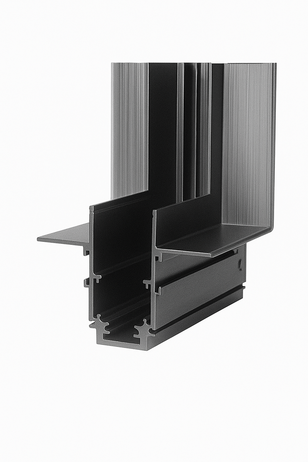 Conector magnético curvo de 90 grados, diseñado para transiciones entre techo y pared en sistemas de rieles magnéticos. Proporciona continuidad estética y eléctrica.