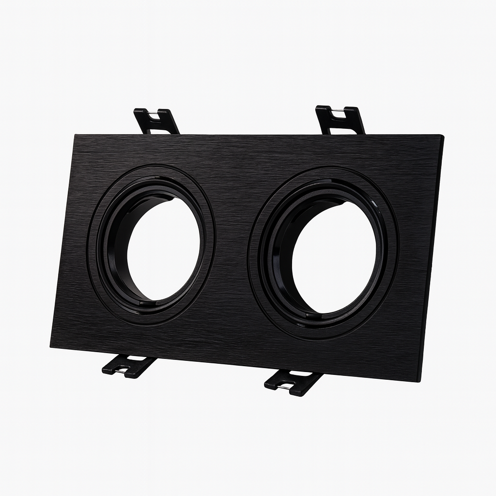 Marco empotrable rectangular basculante Roomlux para dos bombillos. Policarbonato negro. Requiere hueco 160x80mm (exterior 173x93mm).