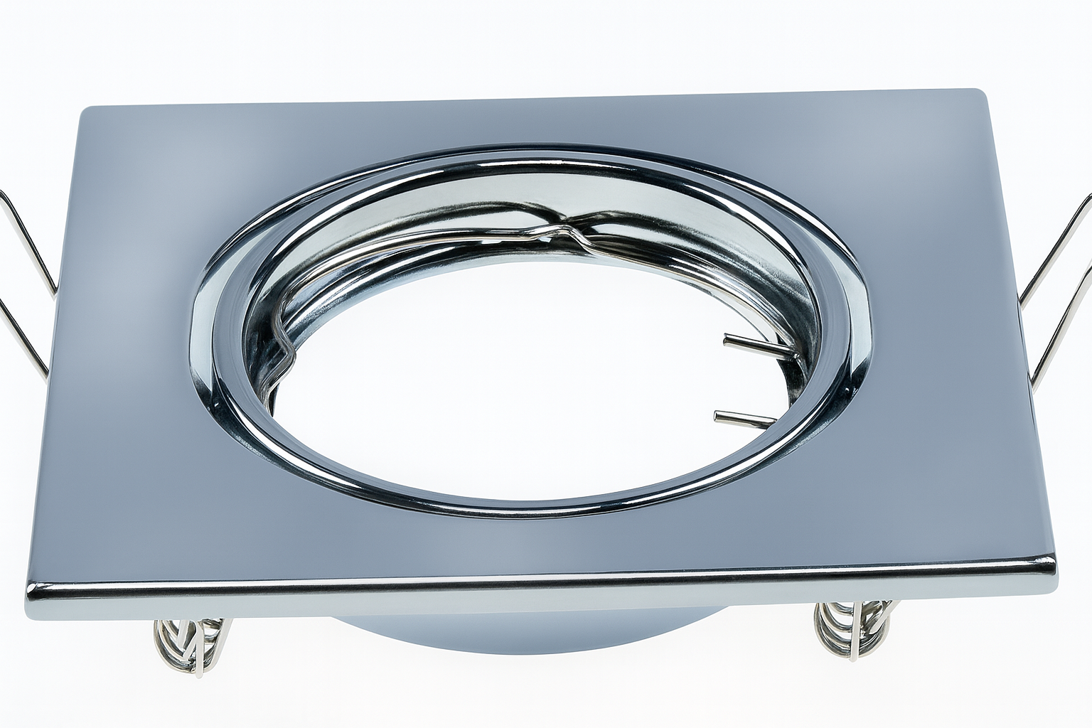 Marco empotrable cuadrado basculante para bombillo GU-10. Acabado cromo (CH), fabricado en acero. Dimensiones 82x82mm.