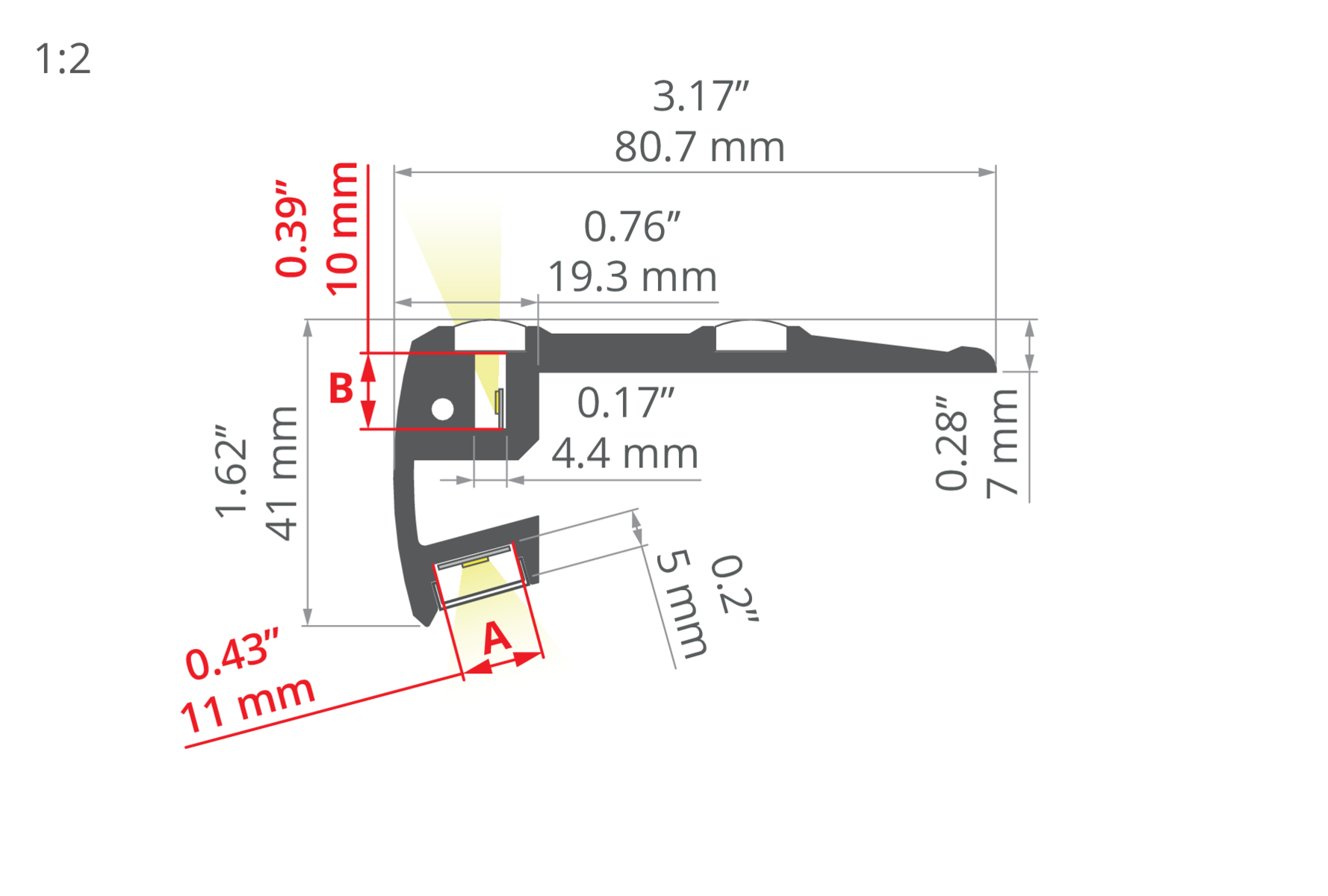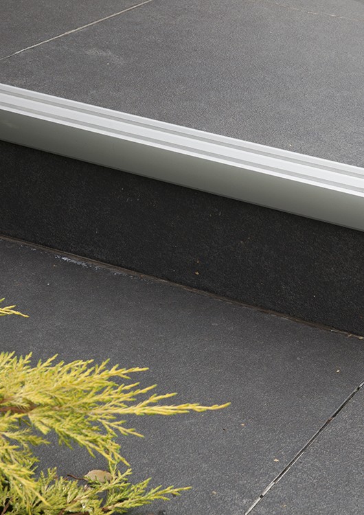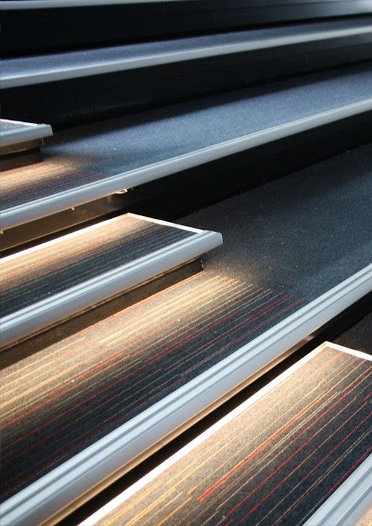 Para la instalación en los pasos Elementos antideslizantes Dos opciones de iluminación Alta resistencia mecánica Aplicación – iluminación de advertencia y protección antideslizante en los escalones Montaje – a un paso, utilizando tornillos correctamente seleccionados Información adicional – al elegir una longitud diferente de perfiles / cubiertas que la disponible en el estándar, también debe elegir el servicio de corte en KLUŚ